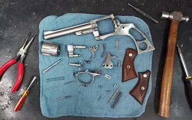 The barrel, slide, frame, and other components undergo thorough cleaning to eliminate dirt, debris, and carbon buildup.